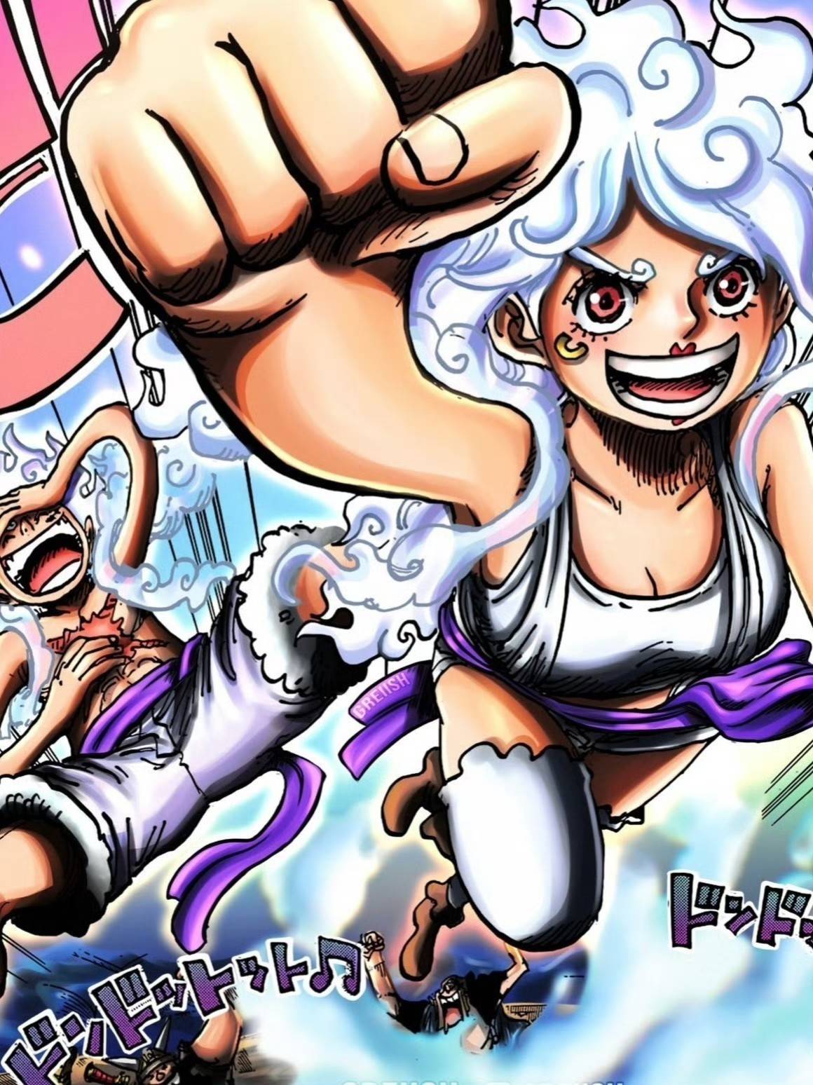 路飞和巨人族战士回到船只上面,东利和布洛基马上吹响号角,命令士兵马上逃出未来岛。火星直接飞过来,他发起火攻,东利和布洛基等人使用盾牌挡住了火星的攻击。路飞开启了尼卡形态,他的解放之鼓的声音很有感染力,其他人纷纷跳起舞蹈。